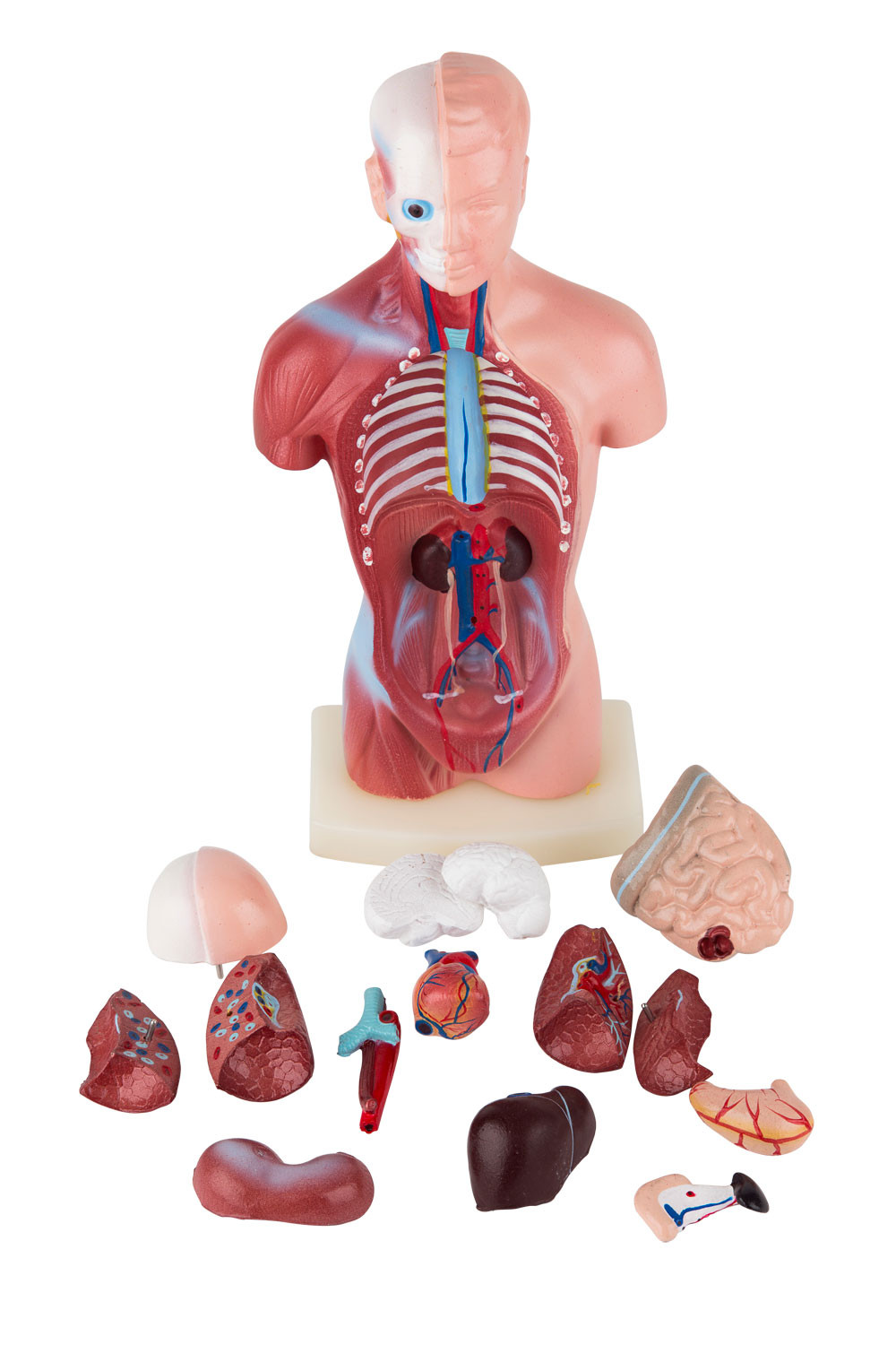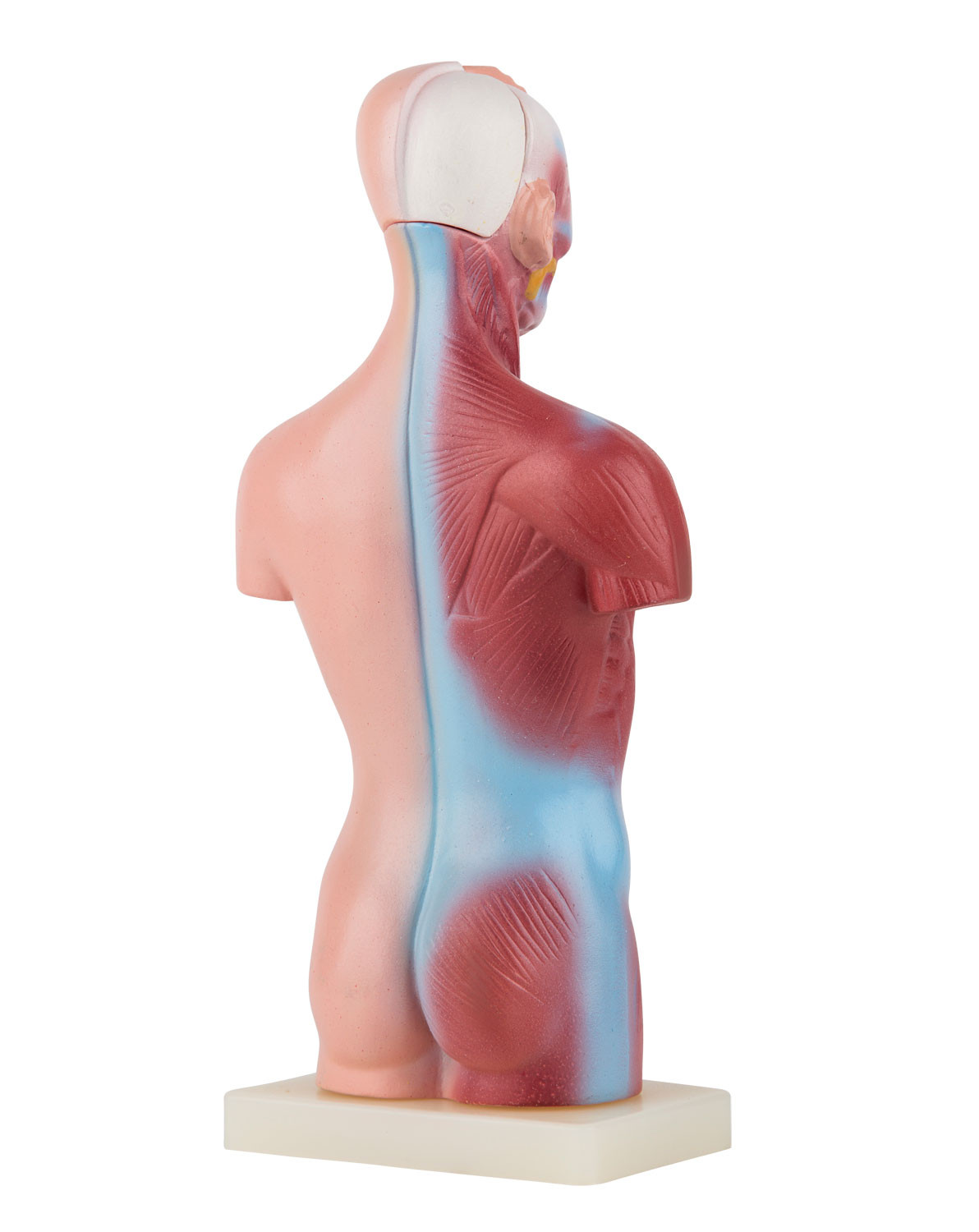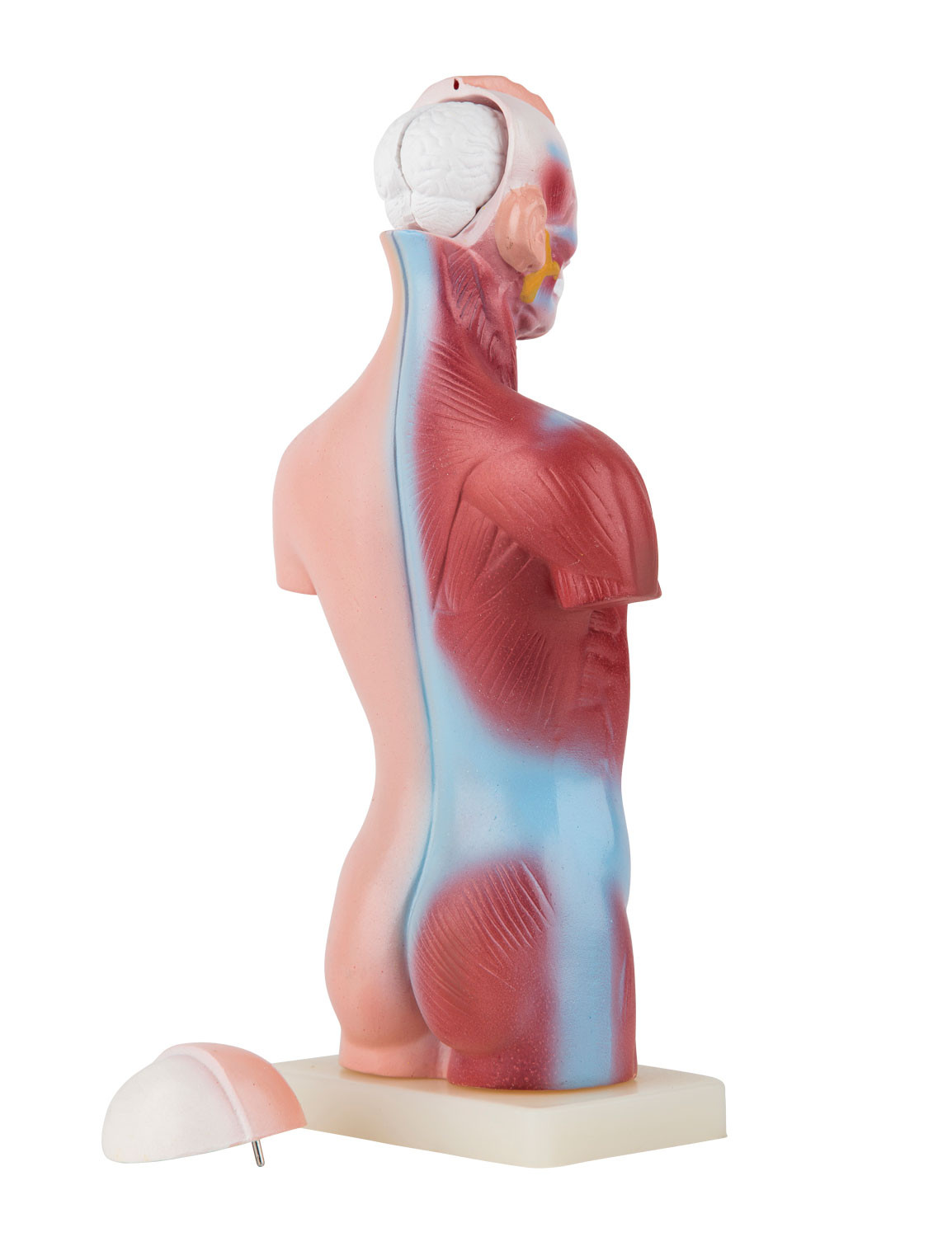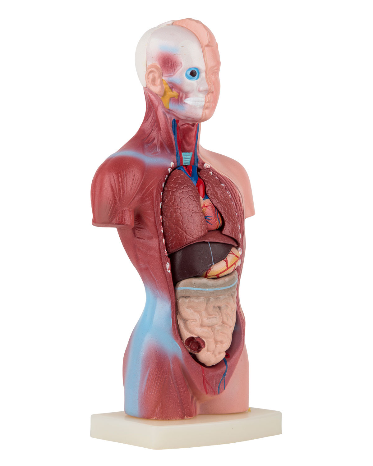 Tento malý a oblíbený mini torzo je vysoký pouze 26 cm. Navzdory své velikosti lze torzo rozdělit na 15 dílů. Trup může být zábavným dárkem nebo sloužit jako pomůcka k vysvětlení nejzákladnějších umístění a tvarů lidských orgánů. Trup má následující volné části: - Odnímatelná zadní část hlavy - 2dílný mozek - 4dílné plíce - Srdce - Jícen, průdušnice a aorta - Bránice - Játra se žlučníkem - Žaludek - Dvanáctník a slezina - Střevní systém. Kromě možnosti vyjmutí výše uvedených volných částí samotný trup ukazuje povrchové svalstvo na pravé přední a zadní straně, i když s menšími detaily. Viditelné jsou jak čelistní svaly, tak i celá záda, včetně ramenních svalů. Vezměte prosím na vědomí, že uvolněné části mohou vyžadovat určitou trpělivost k jejich opětovnému usazení na místo po jejich odstranění.