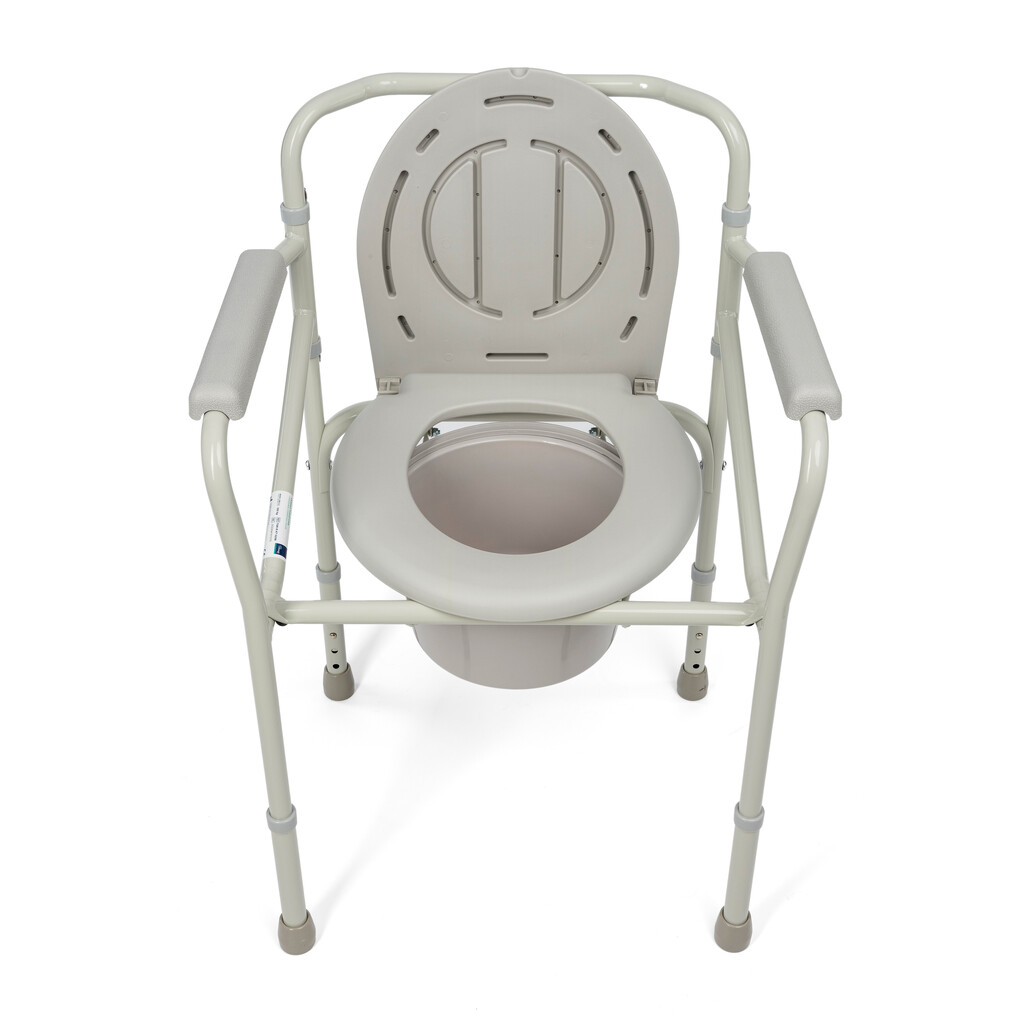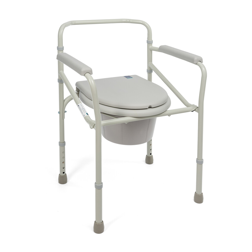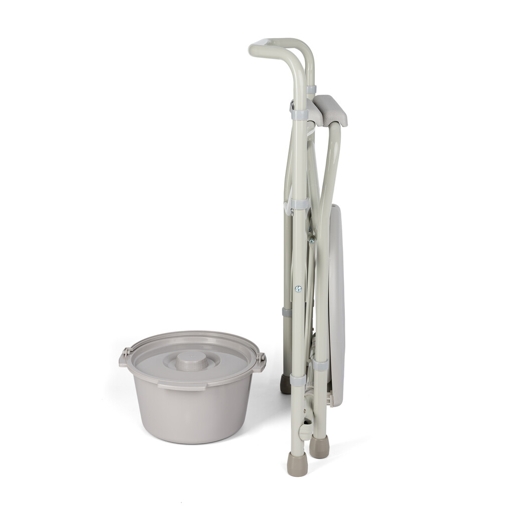 Stabilní a kompaktní toaletní sedátko s hygienickou nádobou pod sedátkem. Skládací konstrukce usnadňuje přepravu a skladování a výškově nastavitelné nohy s gumovými nožičkami poskytují větší bezpečnost a stabilitu. Ideální pro vnitřní použití v různých prostředích.